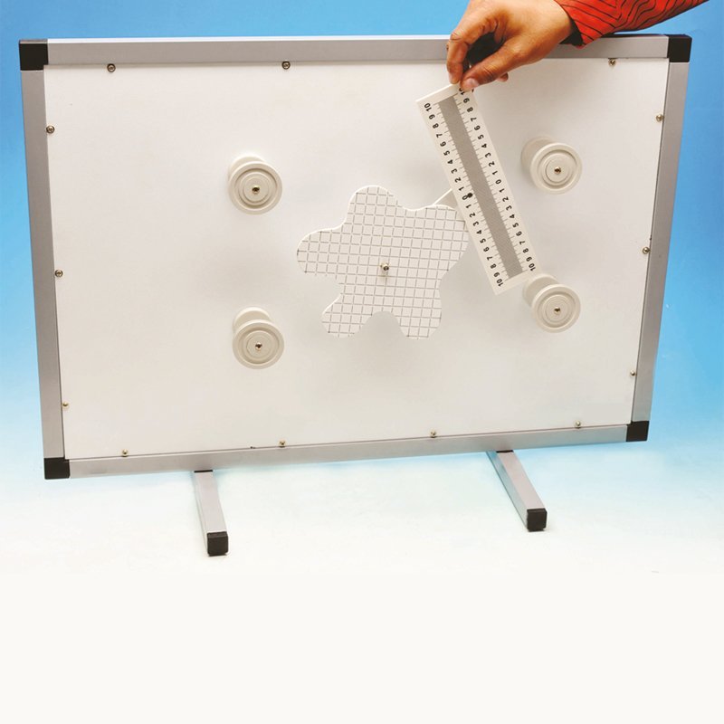 Un corps de forme quelconque aimanté avec système de mesure de distances – 4 poulies sur aimant – 1 bobine de fil – 1 aimant à crochet